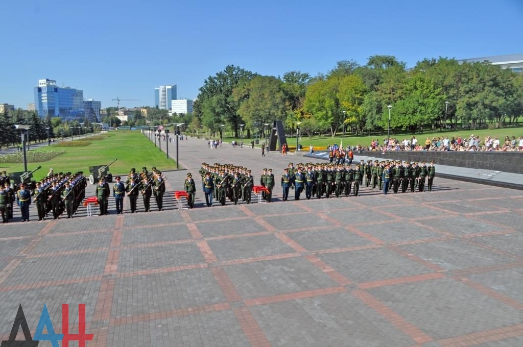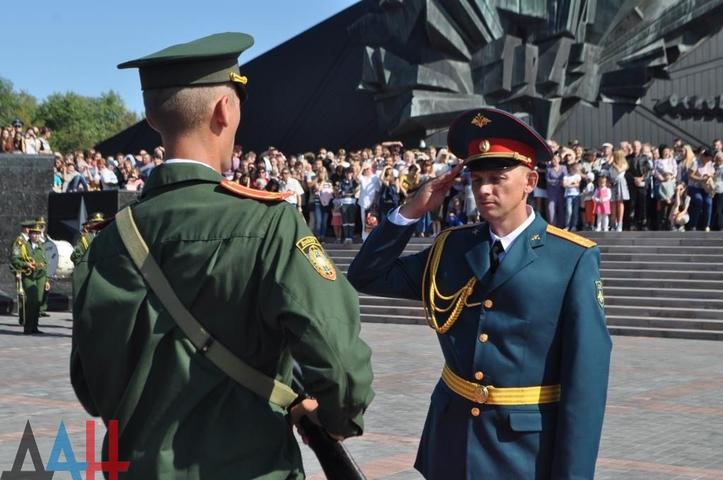 Вначале на площадку перед памятником вынесли государственный флаг Донецкой Народной Республики и знамя ДонВОКУ. Военный оркестр исполнил гимн ДНР. Затем началась непосредственно церемония присяги. В ходе нее курсанты по одному выходили из строя и зачитывали текст клятвы перед своими товарищами. Церемония завершилась парадом курсантов и преподавателей ДонВОКУ.