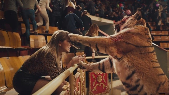 Клип рассказывает о происшествии в цирке. Кадры в ролике следуют в обратном порядке: паникующие люди обратно бегут в здание, разбитые витрины и машины собираются в целые, а тигр заходит назад в окровавленную клетку. В интернете также появился вариант клипа «задом наперёд», в котором все события в ролике идут в прямом порядке. Здесь становится ясным, что привело к панике в цирке.