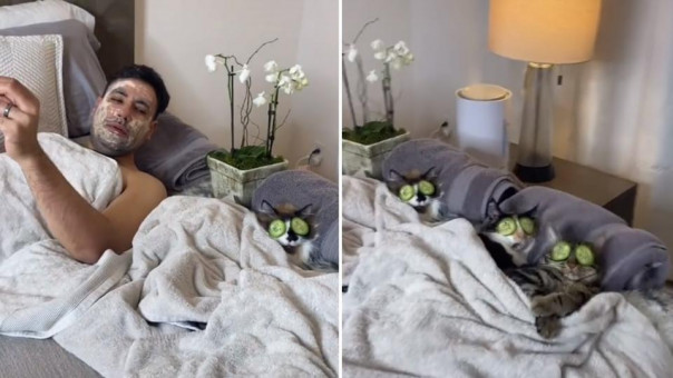 Забавные видео были сняты семейной парой из США Каримом и Фифи. Изначально на странице @dontstopmeowing в TikTok появилось видео того, как Фифи застает мужа в постели с котом Чейзом. Мужчина и питомец отдыхают с огурцами на глазах, при этом кот также выглядит получающим удовольствие. Когда хозяйка в шутку просит прекратить и снимает огурцы с кота, животное возмущается. А когда Фифи кладет огурцы обратно на мордочку пушистого, тот продолжает наслаждаться спа-процедурами.