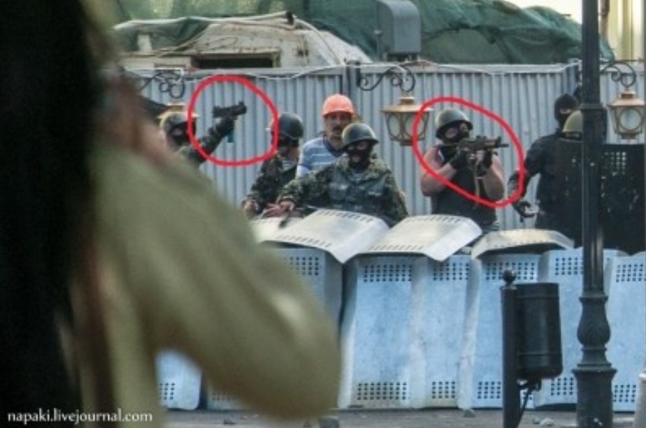 Тем временем неподалёку подготовили "снайперов", которые станут спусковым крючком для толпы - несколько десятков молодчиков, вооруженных не только коктейлями Молотова, но и огнестрельным оружием. Молодчики, естественно, были переодеты в "снайперов" - то есть в камуфляж, украшенный георгиевскими ленточками и красными повязками, чтобы даже самый тупой футбольный фанат сообразил кто перед ним.