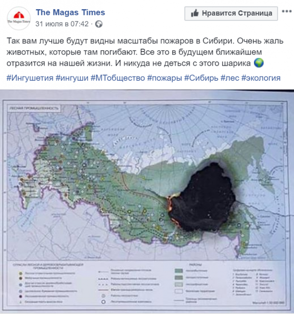 С пожарами в Сибири вообще история интересная. Горит каждый год, иногда и посильнее, чем в этом году. Во многом это процесс естественный, во многом — творение рук человека, порой и с целью сокрытия незаконных вырубок. Но такой резонанс — только в этом году. Страшные фотографии сгоревших животных — правда по элементарному поиску выясняется, что это вовсе не Сибирь в этом году, а Греция, или Калифорния несколькими годами ранее. Страшные карты – мол оцените масштаб – где на месте Сибири чернеет огромное выгоревшее пятно. И нет – у этих людей не плохо с математикой, деньги же они считать умеют, особенно те, что получают от кураторов. Тут всё плохо только с совестью.