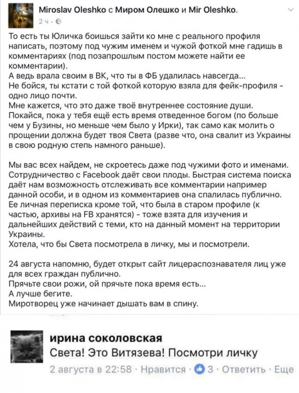 Теперь у нас есть официальное признание, что Фейсбук сливает данные «Миротворцу». Как мы его получили? Все очень просто. Не зря я всегда говорила, что длинный язык не в меру разговорчивых кастрюль их же и погубит! Зашла в ФБ с аккаунта подруги, чтобы хоть какую-то связь с нужными людьми из Киева иметь, так как все мои аккаунты в ФБ заблокированы стараниями подгузников Авакова и штатных стукачков на службе у СБУ, и тут такая удача. Вот что оно понаписало!
