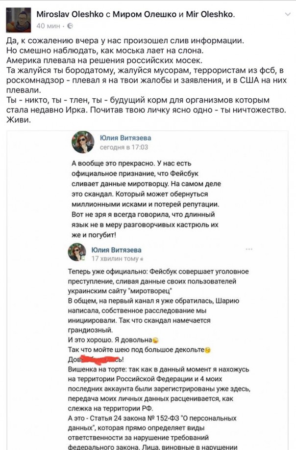 Теперь уже официально: Фейсбук совершает уголовное преступление, сливая данные своих пользователей украинскому сайту «Миротворец». Подробнее о начале истории здесь.