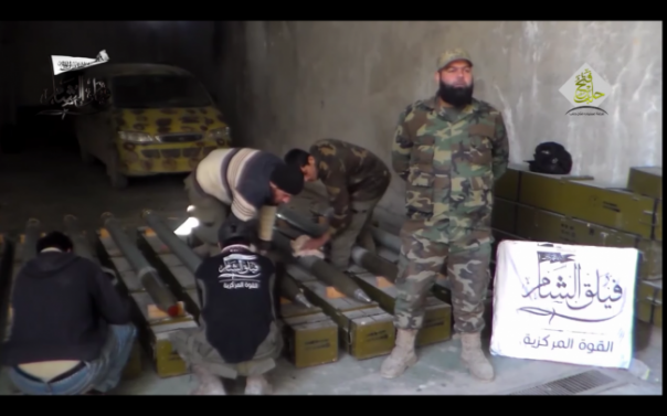 Подготовка к стрельбе болгарскими ракетами «Град» по Военной академии в Алеппо в декабре 2016 года. Видеоролик от сирийской «Аль-Каиды» (нынешней «Тахрир аль-Шам»). Фото: twitter.com.