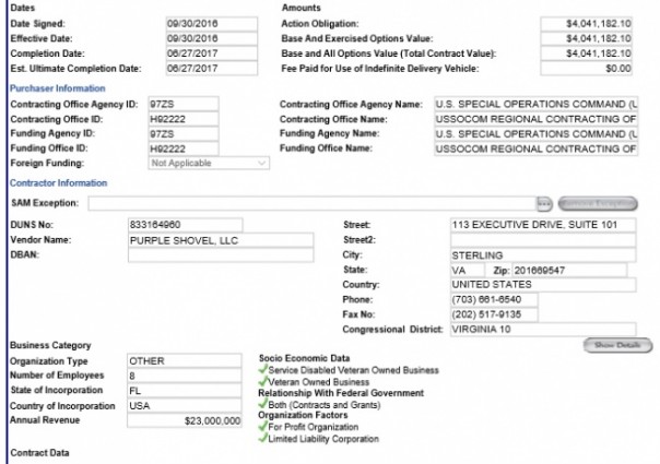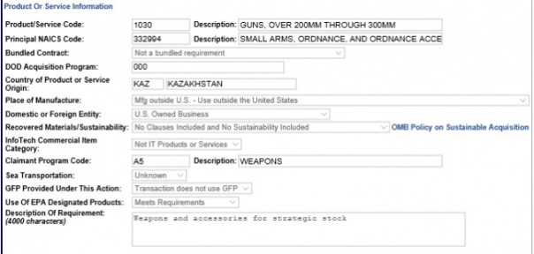 Purple Shovel закупила для SOCOM оружия из Казахстана на $ 4 млн. Скриншот с сайта fpds.gov.