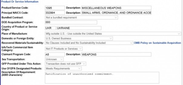 Один из заказов (на $ 1,5 млн) для UDC на поставку 95 противотанковых гранатометов SPG-9 из Чехии. Скриншот с сайта fpds.gov.