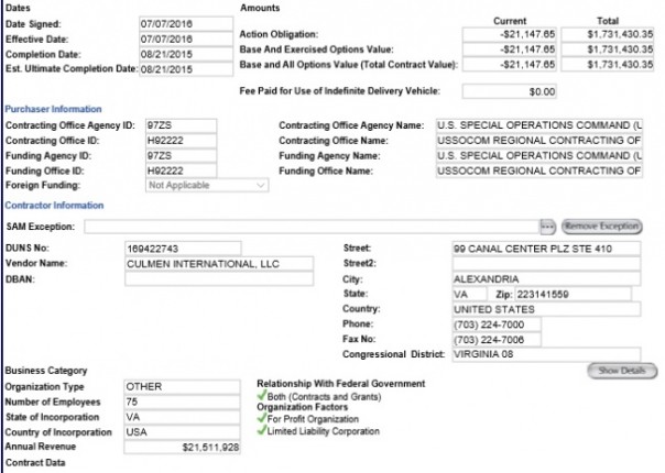 Контракт с Culmen International предполагал поставку украинских вооружений на $ 21 млн, но в середине 2016 года его сократили до $ 1,7 млн. Скриншот с сайта fpds.gov.