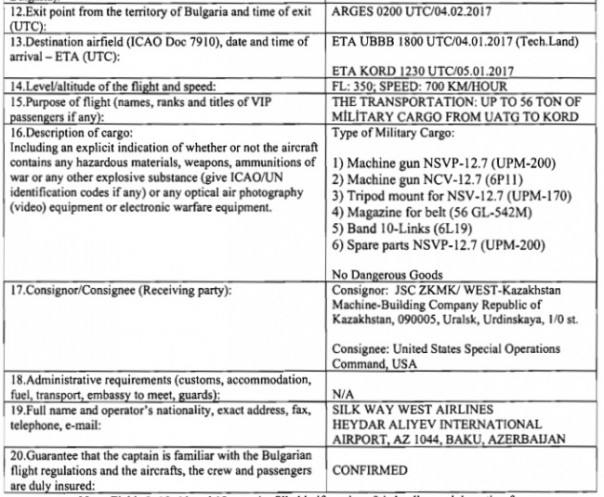 Что прошло через сайт Федеральной системы закупок США и одновременно есть в документах азербайджанской Silk way, так это поставки «нестандартного» оружия из Казахстана. Его на $ 4 млн в конце прошлого года закупила американская Purple Shovel, а 4−7 января самолетом Boing-747 азербайджанских авиалиний 56 тонн танковых и пехотных крупнокалиберных пулеметов НСВ «Утес» доставили по маршруту Атырау-Баку-Чикаго. Поставщиком значилось АО «Западно-Казахстанская машиностроительная компания», а вот в качестве получателя выступала не Purple Shovel, а сам заказчик — Главное управление войск специального назначения Минобороны США (SOCOM).