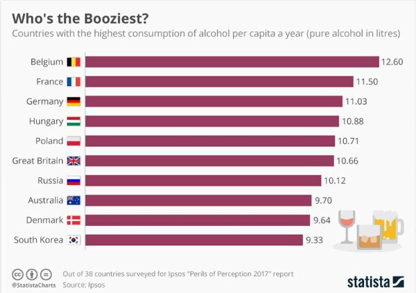 А, для вас, наверное, это тоже сюрприз? Весь на весь мир известно, что самыми отъявленными пьяницами являются исключительно русские, в то время, как трезвые и педантичные немцы ограничиваются кружкой пива за ужином? Спешу огорчить, всё уже давным-давно не так. Если не верите нашей статистике, вот, пожалуйста, буржуйская на 2017-й год. Если сюда добавить страны Восточной Европы и Украину с Беларусью, мы навряд ли войдём даже в десятку. Надо же, и в этом запад нас обошёл!