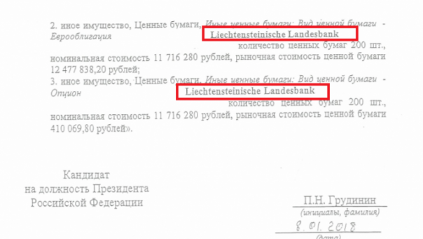 — Источник 1, Источник 2) в котором у него хранятся структурные ноты (200 шт. стоимость ценной бумаги — 13 миллионов рублей ), еврооблигации (200 шт. стоимость ценной бумаги — по 12 миллионов рублей) и опционы (200 шт по 400 тыс рублей), то выясняется что господин Грудинин не только довольно богатый человек, но еще и человек с хорошим финансовым вкусом и связями в Европе. Дело в том что даже очень богатому человеку извне ЕС довольно сложно открыть счет и держать ценные бумаги в Liechtensteinische Landesbank без соответствующих связей и рекомендаций «правильных людей».