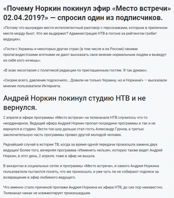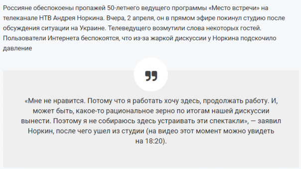 Телеведущий политического ток-шоу "Место встречи" на НТВ Андрей Норкин покинул студию посреди эфира и с тех пор больше не появлялся в программах телеканала, несмотря на то, что также является ведущим передачи "Изменить нельзя".