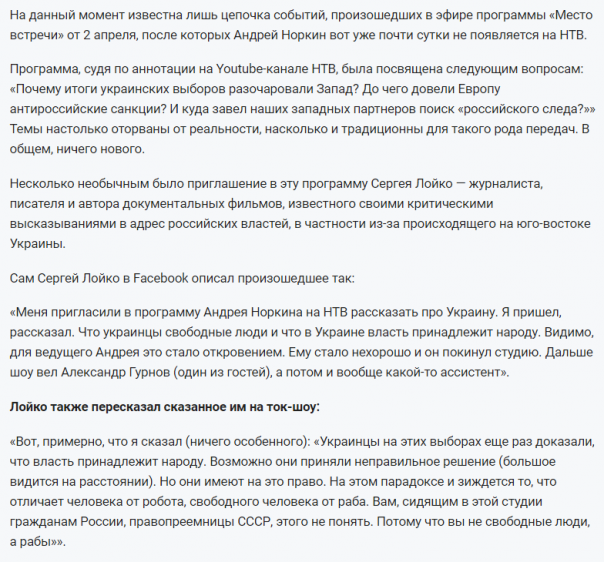 Лойко заявил, что Норкин не раз его перебивал и просил прекратить выступление, после чего заявил, что из-за подобных речей может лишиться работы и ушел из студии. При этом Стоит отметить, что Норкин также не вышел в вечерний эфир в ток-шоу "Изменить нельзя", ведущим которой также является. Источник